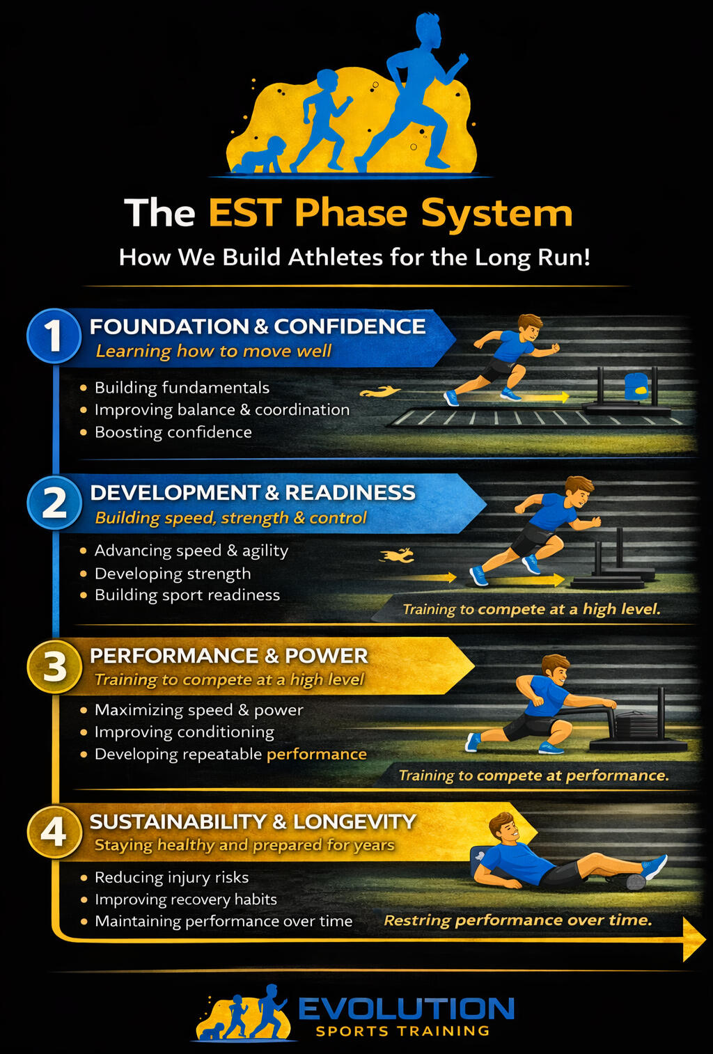 The EST Phase SystemAt Evolution Sports Training, we don’t believe in random workouts. Every athlete follows a long-term plan designed to match their age, experience, and sport. As athletes grow, their training evolves with them—building the right skills at the right time.Phase 1: Foundation & ConfidenceLearning how to move wellThis phase focuses on teaching athletes how to run, jump, stop, and change direction safely and efficiently. Athletes build basic strength, coordination, and balance while gaining confidence in their movement. The goal is to create a strong base so they can train harder and progress without breaking down.Parents can expect: